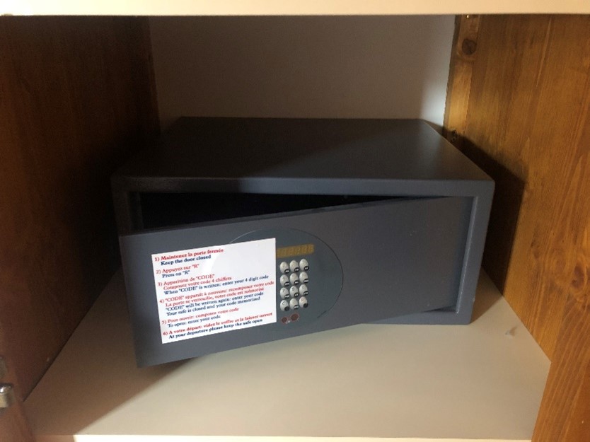 À votre arrivée, veuillez vérifier immédiatement que le coffre-fort a été laissé ouvert par le client précédent. S’il est fermé, veuillez contacter NV3 en utilisant les détails sur le bon d’hébergement, afin qu’ils puissent demander le code du client pour l’ouvrir.